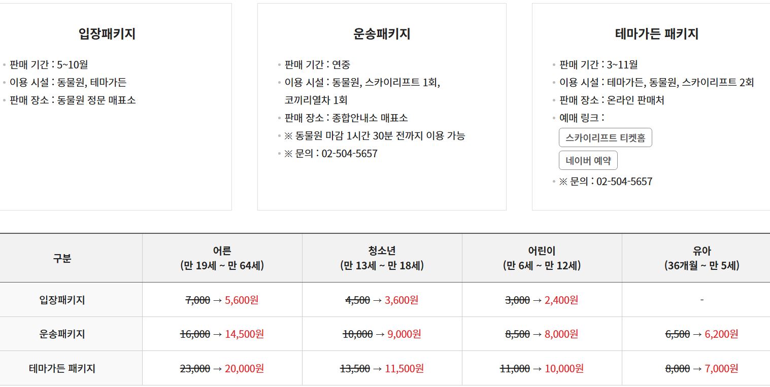 💲 입장권 구매 : 현장에서 아래 요금표 금액으로 구입 가능하지만, 네이버, 쿠팡, 11번가, G마켓, 옥션에서 미리 온라인 티켓을 예매하시면 아래 요금보다 20% 더 저렴하게 구입이 가능합니다. (동물원 기준 성인 4,000원, 청소년, 2,400원, 어린이 1,600원)